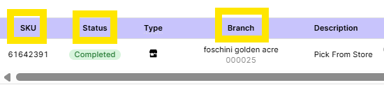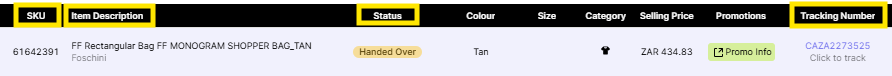 Displays all purchased items (SKU, description, size, colour, status, tracking number).